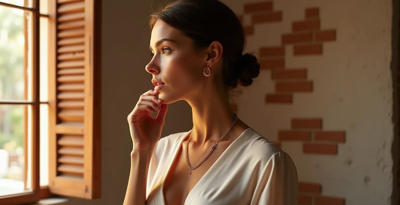 En el estilismo de joyas, una de las reglas de oro es la del punto focal. La «zona del retrato», que abarca desde el rostro hasta el escote, es el centro de atención en la mayoría de las interacciones sociales. Sobrecargarla con demasiados elementos llamativos puede crear un efecto de ruido visual que resta elegancia. La norma general dicta elegir una pieza protagonista: o unos pendientes espectaculares o un collar que acapare todas las miradas. Rara vez ambos.